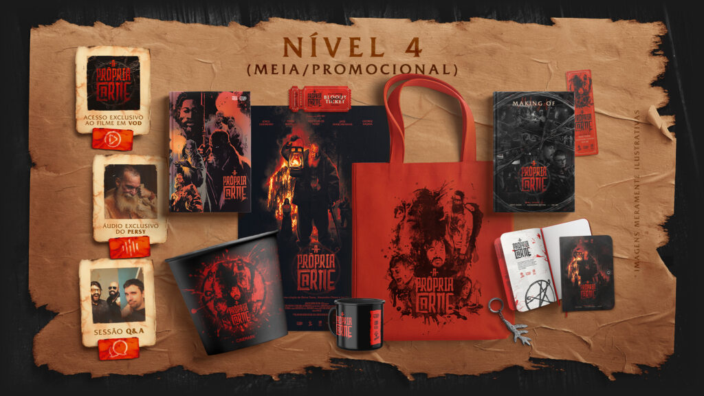 Além dos benefícios, a campanha conta com vendas para uma sessão de Q&A virtual de 2 horas com os criadores por trás de “A Própria Carne” (R$ 99,90); workshops com Ian SBF de direção, montagem e roteiro (R$ 299, 90/cada); e itens extras colecionáveis e exclusivos, que podem ser comprados à parte, como um disco de vinil com a trilha sonora original do filme (R$ 149,90), uma sinete colecionável ( R$ 149,90) e um pin colecionável em apoio ao Abrigo Casa do Vira-Lata, no qual todo o lucro será doado para a instituição (R$ 30).