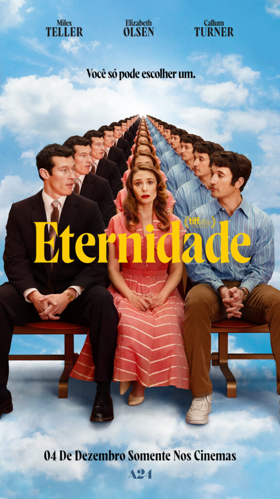 Eternidade (Eternity, 2024), longa-metragem estadunidense de romance, drama e comédia, produzido pela A24 e distribuído pela Elo Studios, estreia, oficialmente, nos cinemas brasileiros, a partir do dia 04 de dezembro de 2025, com classificação indicativa 14 anos e 114 minutos de duração.