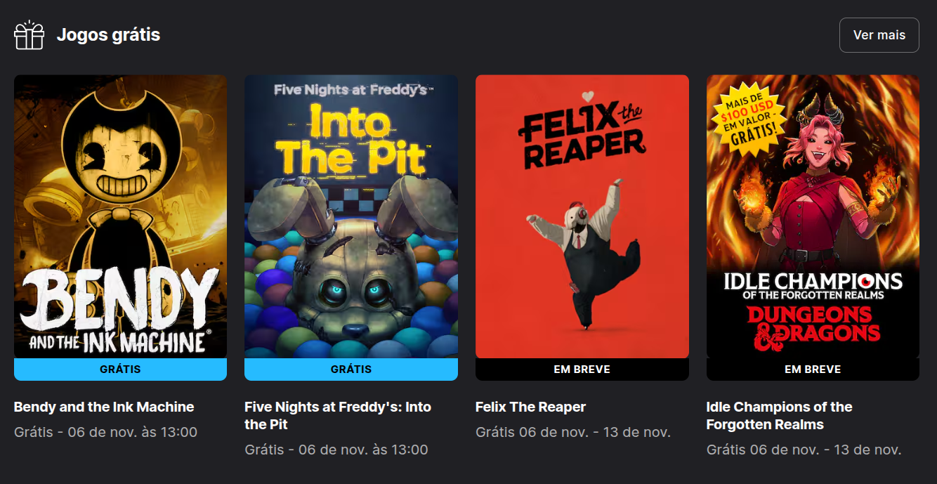 Toda quinta-feira, a Epic Games atualiza a lista de jogos gratuitos, liberando novos títulos para a galera baixar e curtir sem gastar um centavo. Para saber quais são os jogos disponíveis, você pode acessar a o site da Epic Games Store ou o X (antigo Twitter) ou, melhor ainda, visitar nosso site onde publicamos as novidades todas as semanas!