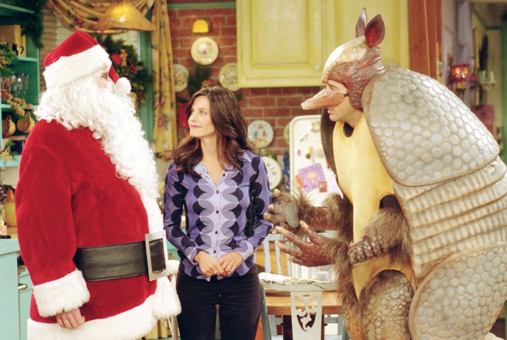 • “Aquele com o Tatu das Festividades” (Temporada 7, Episódio 10): provavelmente o episódio festivo mais icônico, em que Ross se fantasia de Tatu Natalino para ensinar Hanukkah a Ben, enquanto Chandler se veste de Papai Noel e Joey de Superman – uma mistura perfeita de Natal e Hanukkah.