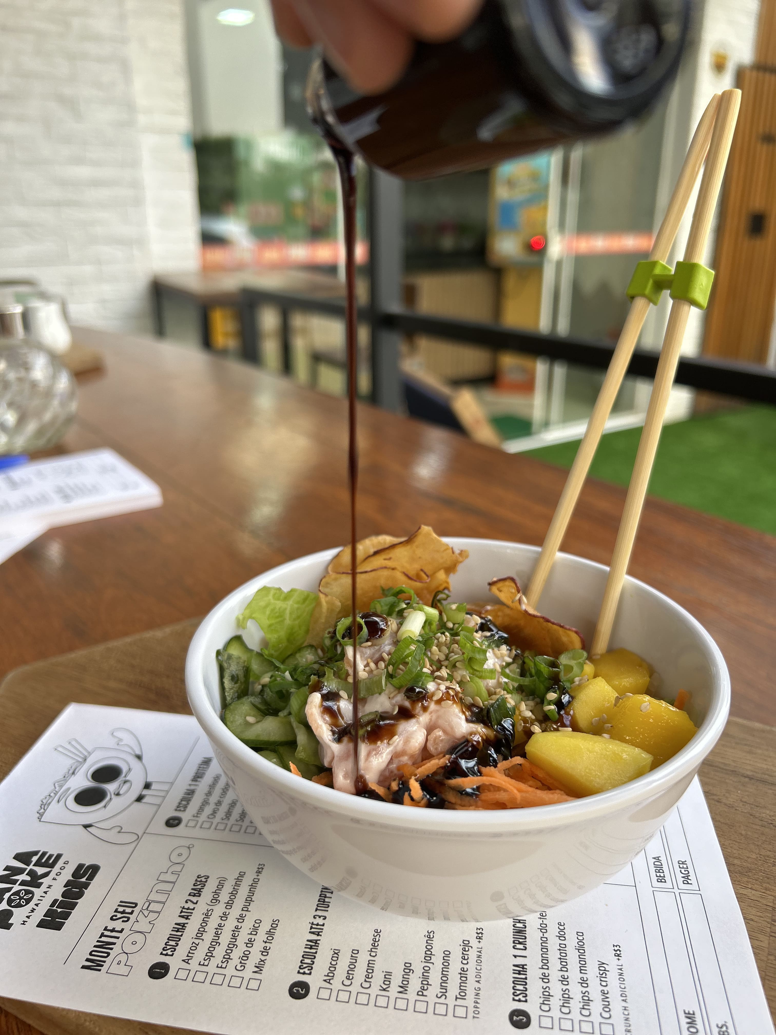 No “Monte seu Pokinho”, os pequenos poderão montar seu poke entre 30 ingredientes, escolhendo até duas bases, três toppings, um crunch, uma proteína e um molho de sua preferência, além da finalização com gergelim ou cebolinha.