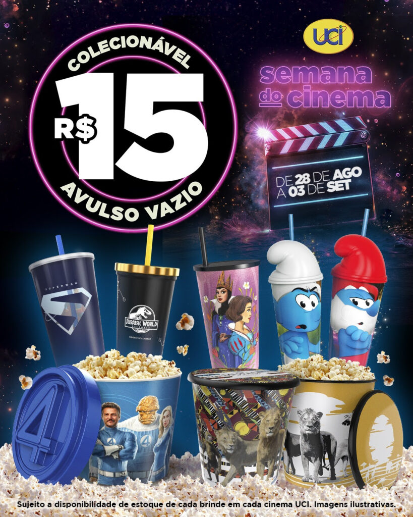 Entre os dias 28 de agosto e 3 de setembro, durante a Semana do Cinema, a UCI vai oferecer uma oportunidade especial para os fãs de cinema completarem sua coleção de brindes exclusivos. Copos temáticos de Superman, Jurassic World, Branca de Neve e Smurfs, além dos baldes de pipoca de Quarteto Fantástico e Mufasa, estarão à venda avulsos por apenas R$15 cada.